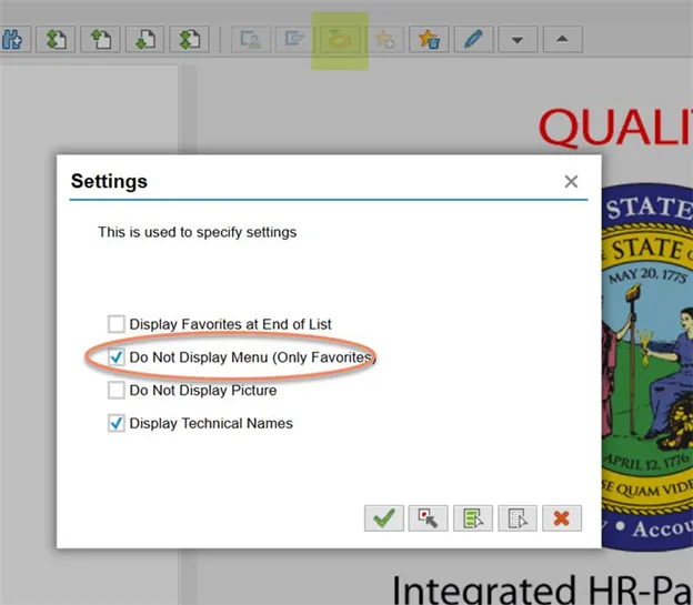 Tip: Workflow inbox icon (but can get to it via the T-code). In the upper-left corner, go to Extras > Settings and you get the below options; they'll need to un-check this option to have the WF inbox icon display.
