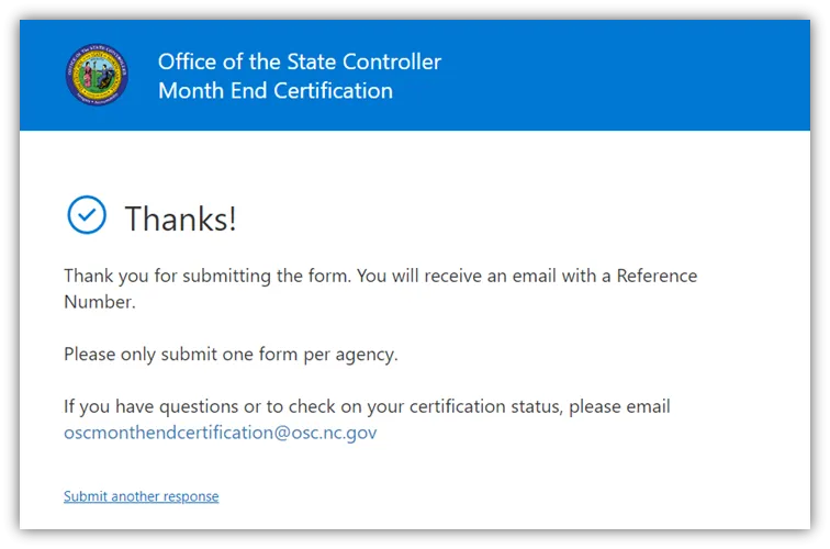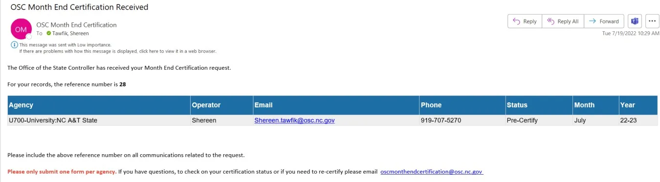 Note: For any question or to check on your certification status, please reply on the automated email or use your reference number and email the Month End Team at: oscmonthendcertification@ncosc.gov.