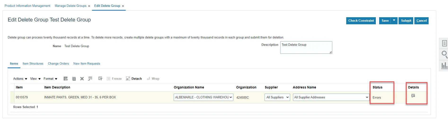 Step 11. If the Item Delete Group Status shows Errors, click the Details icon.