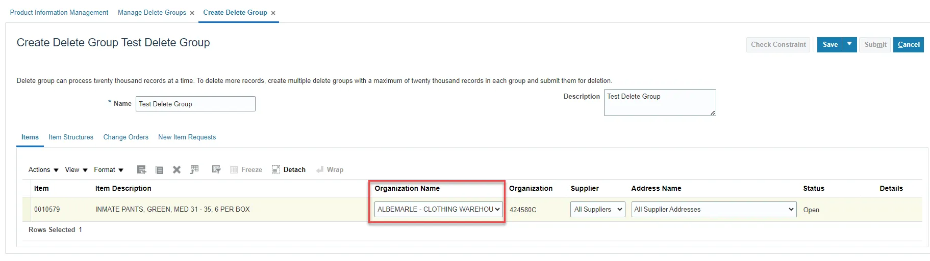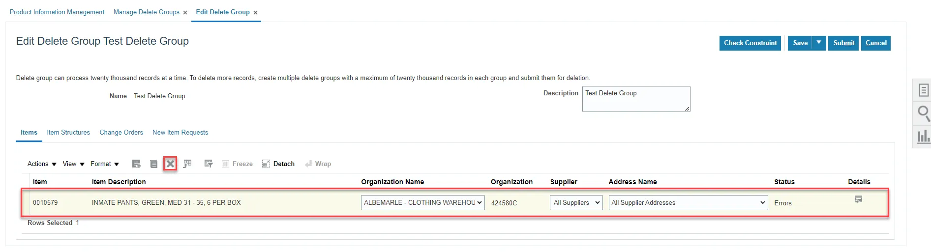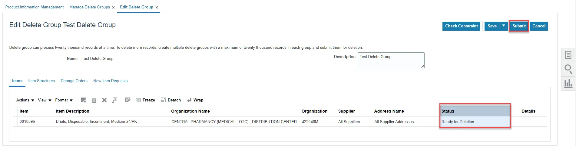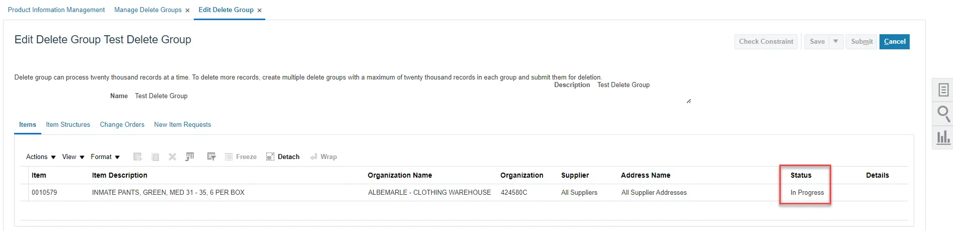 Step 10. The Item Delete Group Status in the Delete Group will show In Progress while checking constraints.