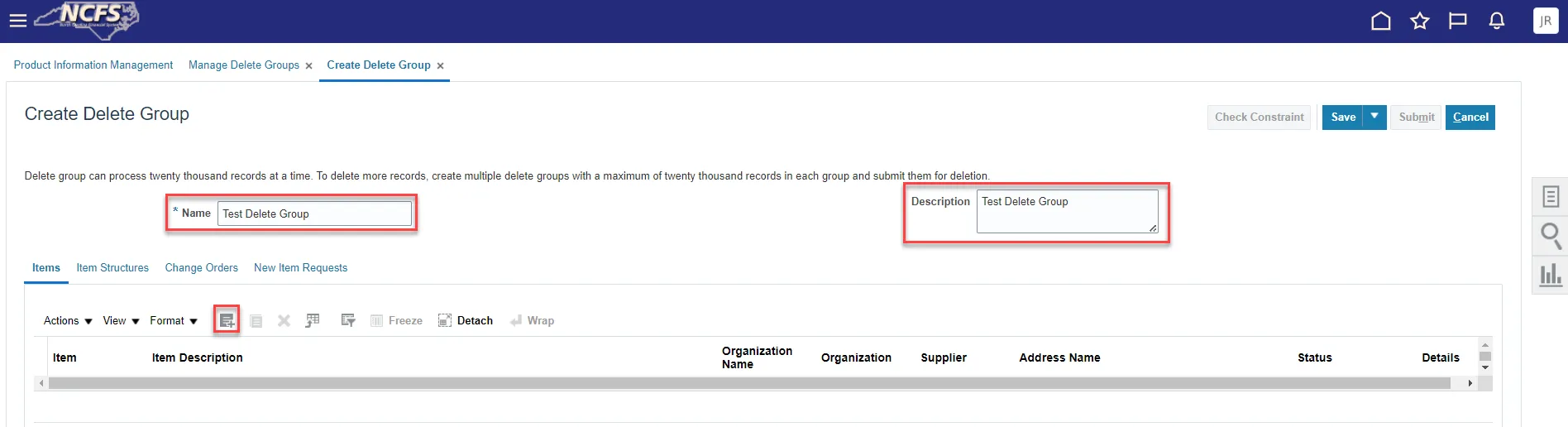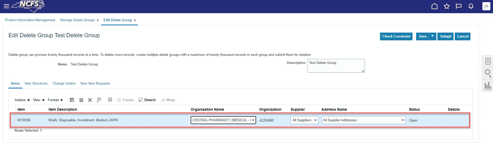 The purpose of this Quick Reference Guide (QRG) is to provide a step-by-step explanation on how to Delete an Inventory Item that is associated to an Inventory Organization in error in the North Carolina Financial System (NCFS).