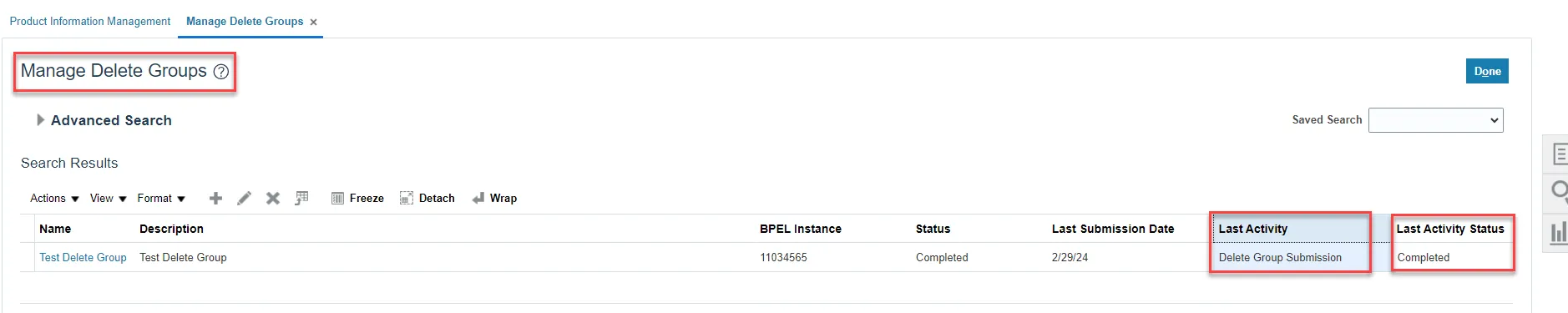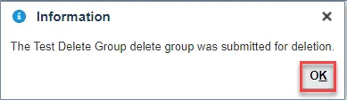 Step 17. Navigate to the Mange Delete Groups screen and the Delete Group Last Activity will show Delete Group Submission and Last Activity Status Completed.