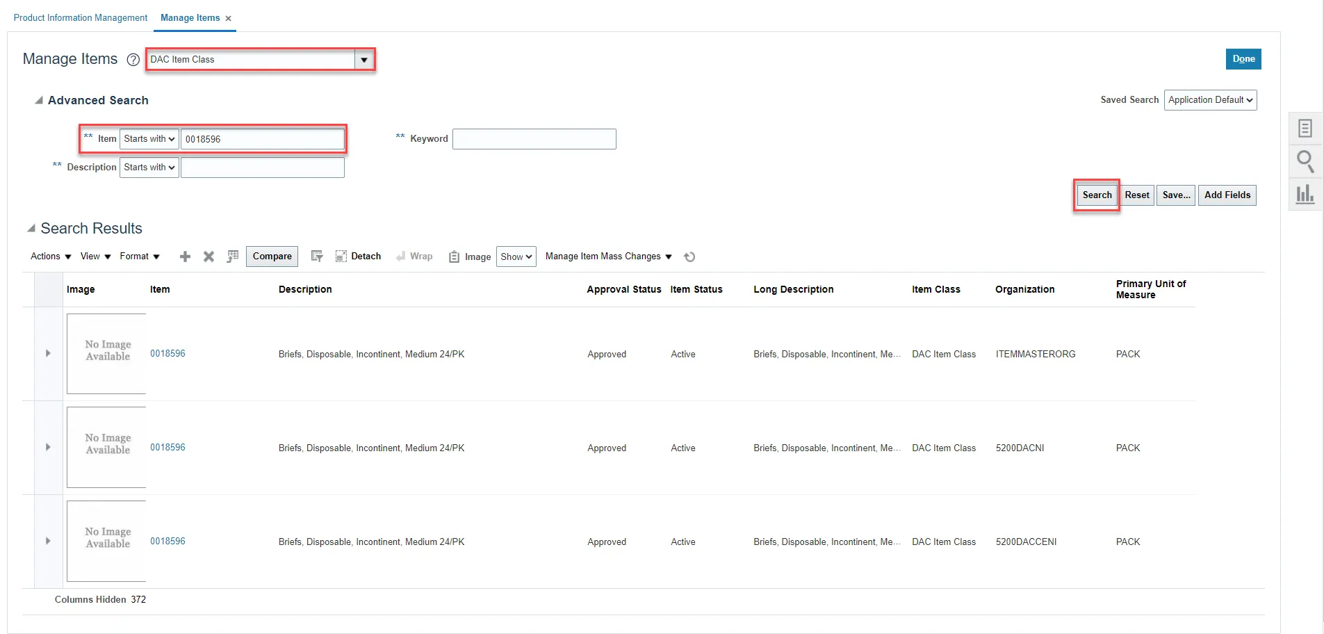Step 18. Navigate to Manage Items task. Select the Item Class. Enter the Item Number into the Item field. Click Search. The deleted item should not be associated with the Inventory Organization (warehouse) selected for deletion.