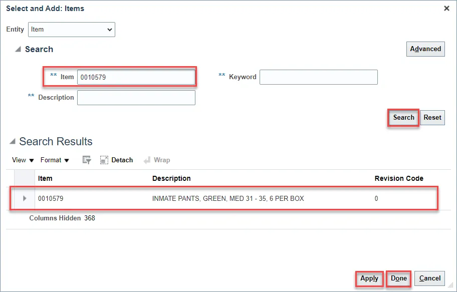 Step 6. Search for the item to be deleted by using the search fields, then click Search. Select the item within the Search Results, then click Apply. When the item(s) to be disassociated are selected click Apply, then click Done.