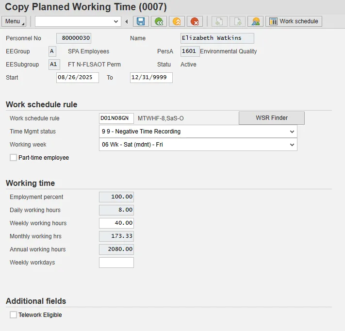Note: Employment percentage must be 100%. The weekly working hours must coincide with the work schedule rule and the employee subgroup. Part-time box should be checked if applicable.