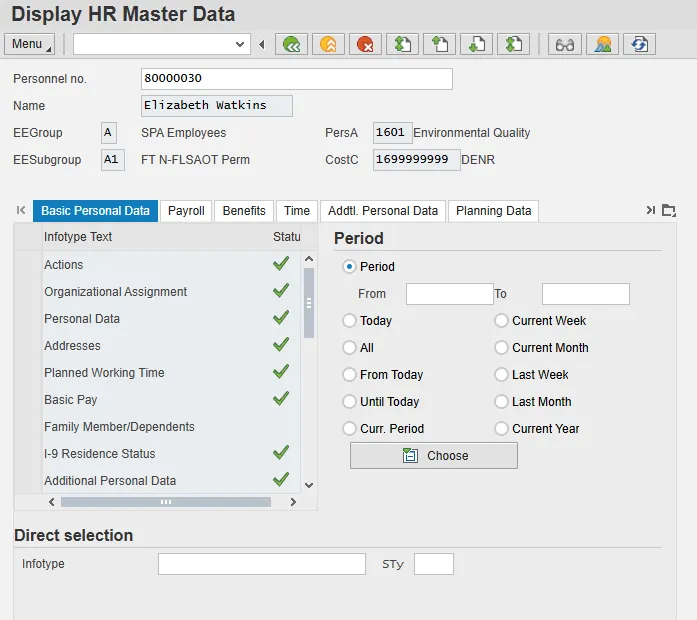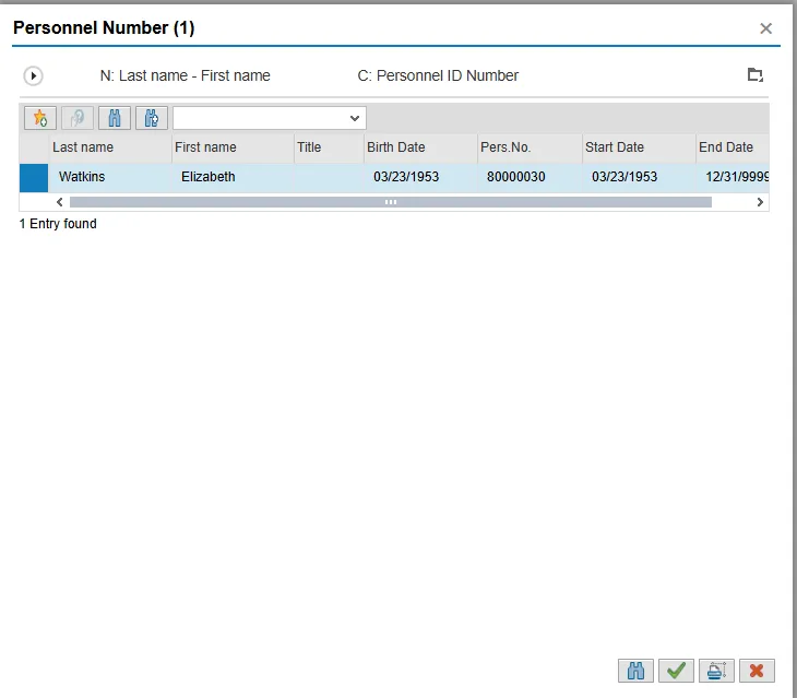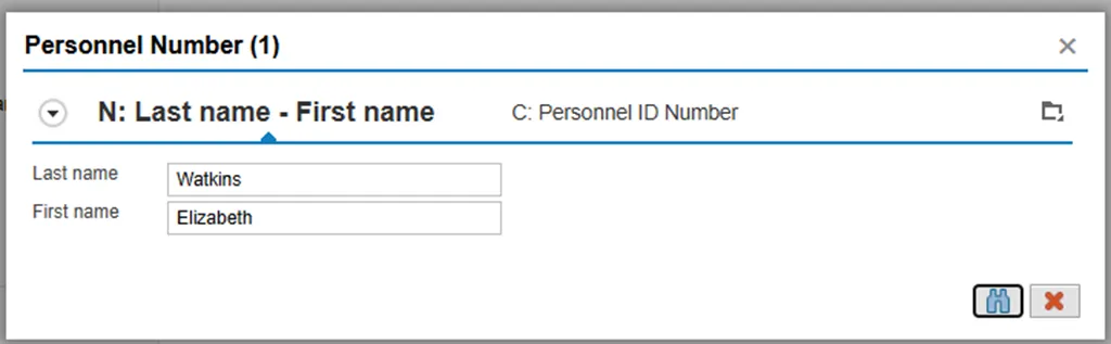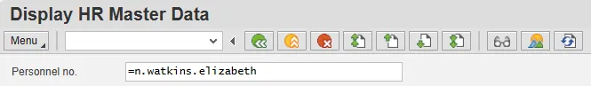 Example 2: Type  =n.watkins.elizabeth in the Personnel no. field and click Enter.