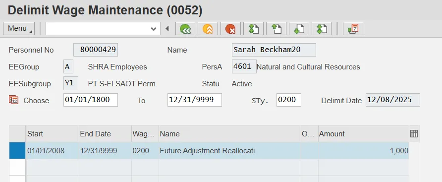 One day past is entered because the Integrated HR-Payroll System will use the day prior to delimit the infotype. If you want the infotype to show an end date the same as when you gave the remainder of the money, you have to enter the delimit date as one day past.