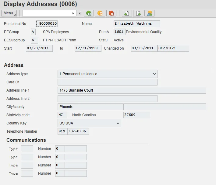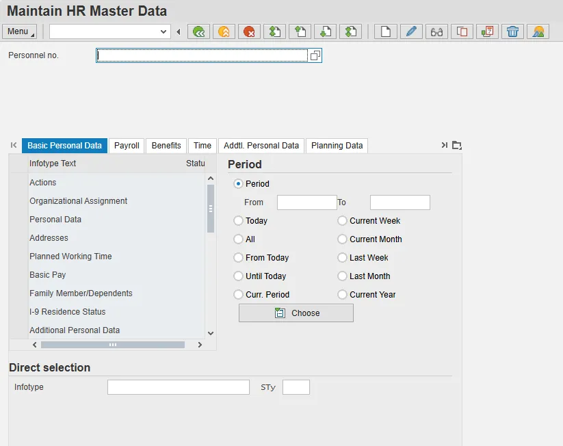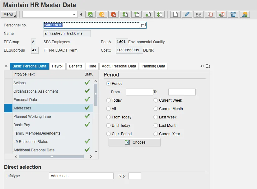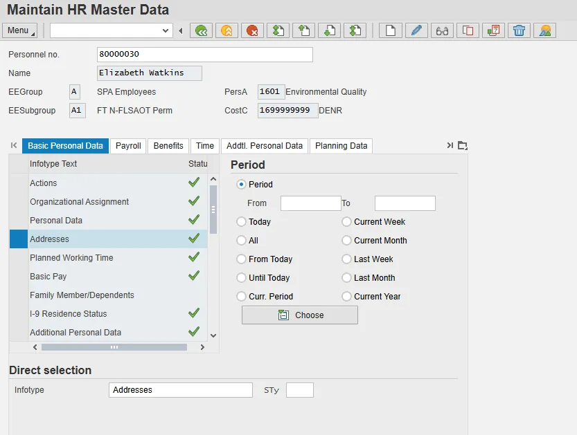 Step 3: Highlight the Addresses infotype or type 0006 in the Direct Selection field and press Enter.