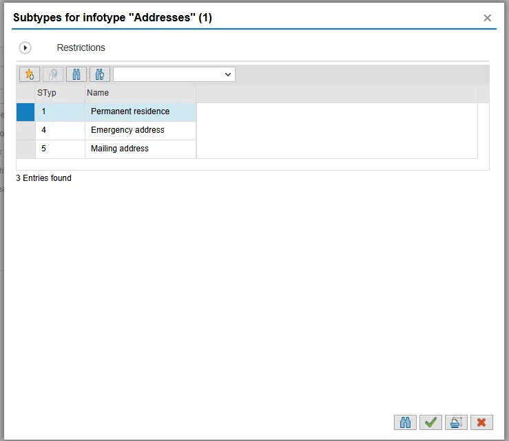 Step 8: Click the Copy (F7) button. The Subtypes for infotype “Addresses” box is displayed.