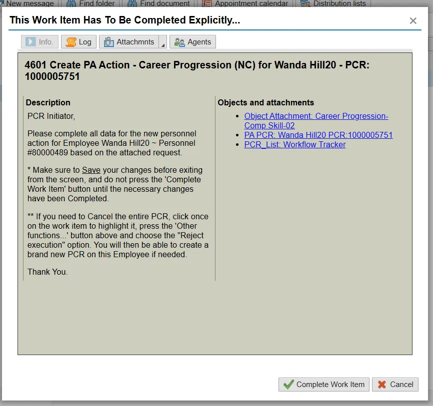 Only once all of the infotype screens within the action have been processed and the system has returned you to the main screen will this Complete button be visible. Now you may complete the PCR in workflow.