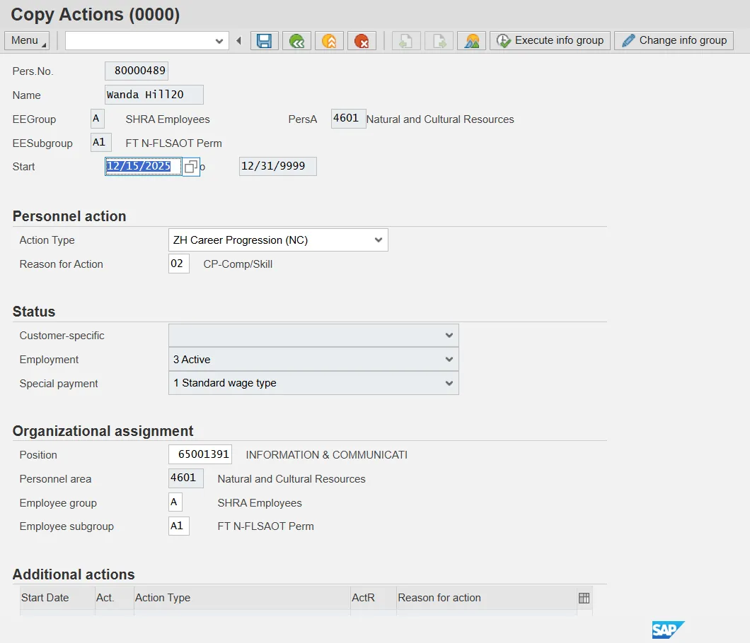 Step 42. The Career Progression Action is complete, but we recommend reviewing via PA20 all infotypes that have been processed.