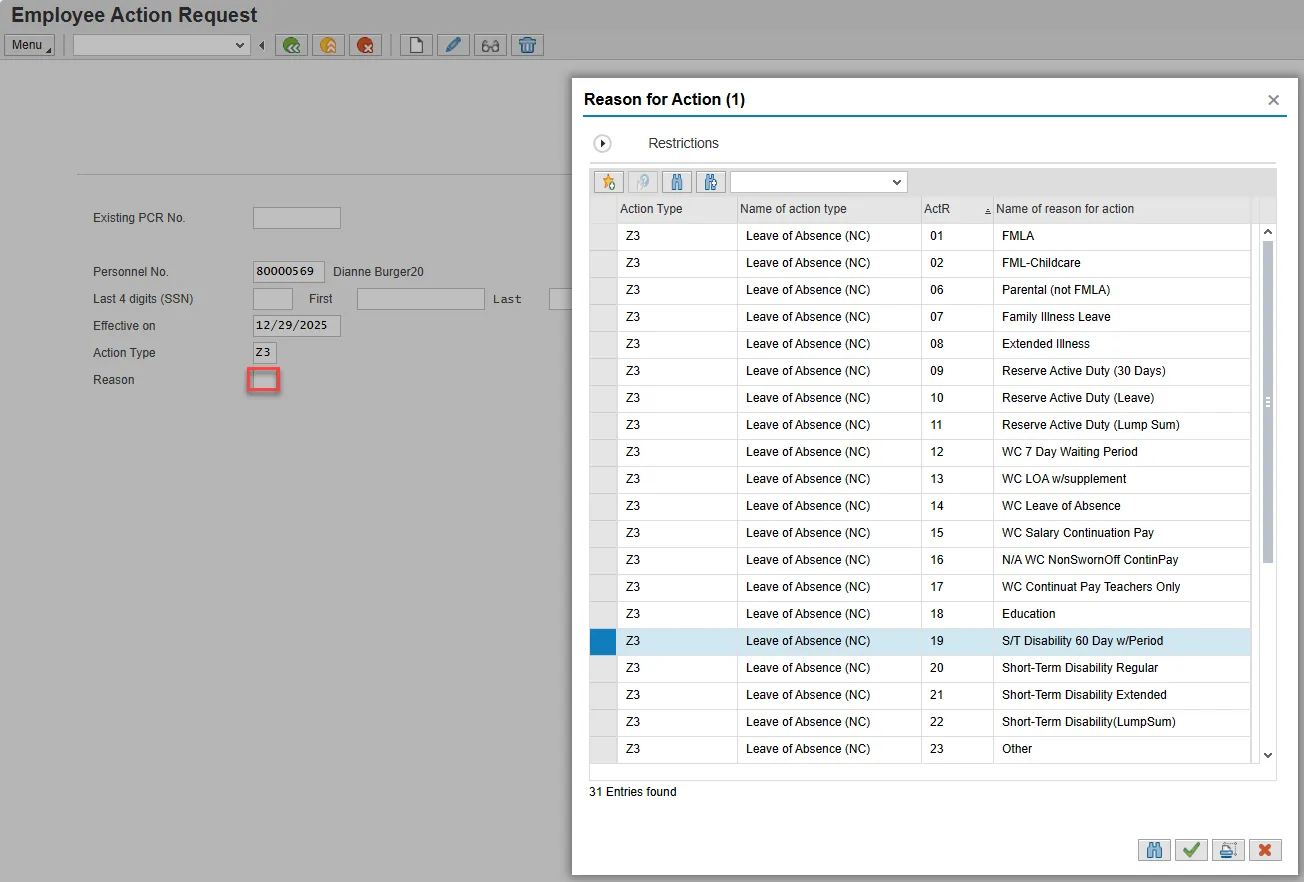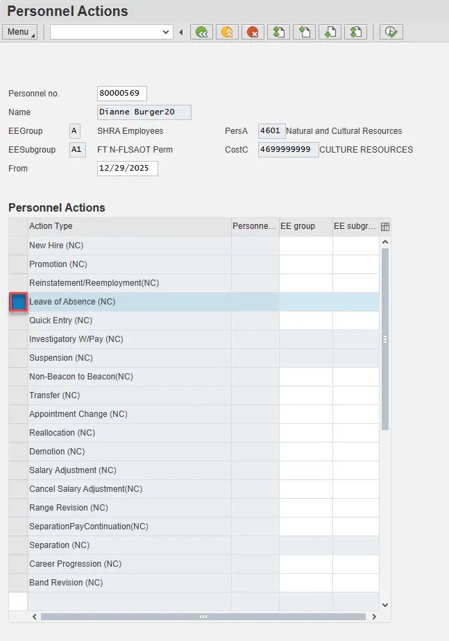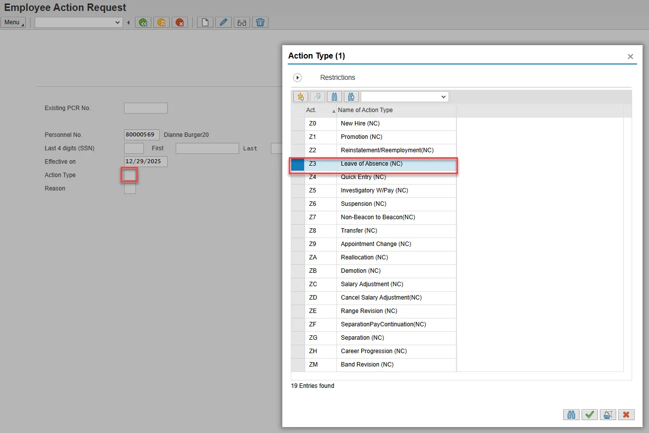 Step 4. Select the Action Type field and access the matchcode. Double click Leave of Absence from the list.