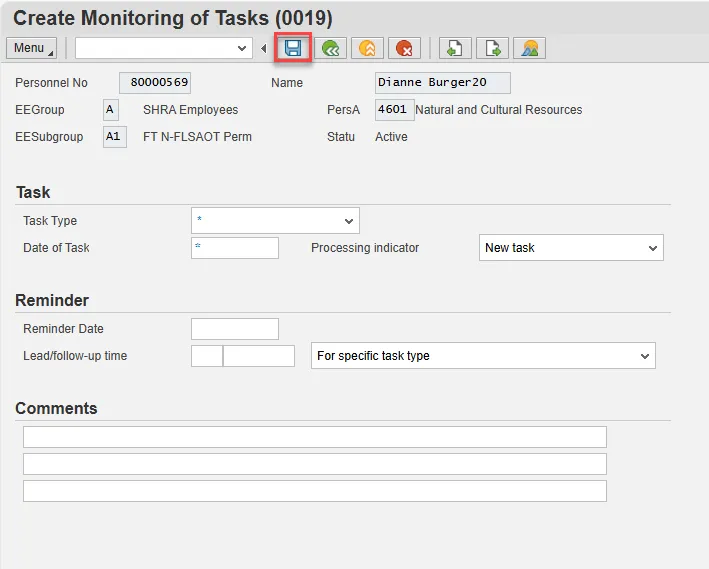 Insert any notes or comments pertaining to the task. To view these task reminders, you can generate the BOBJ Report – B0099 – Employee Deadline Dates. Managers can view for their employees via MSS. If no data entry is required, move to the next infotype screen by clicking the Next Screen button.