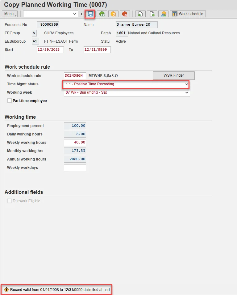 Step 16. On Copy Planned Working Time (0007), all full-time employees must be on a 5 -day, 8-hour per day work schedule (exception: DOT employees). The easiest way to accomplish this is to use D01N08GN. All employees, whether full-time or part-time, must be positive time recording.