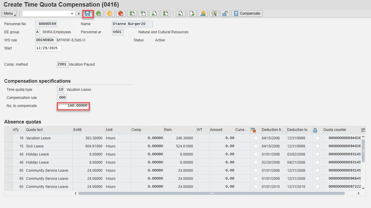 The system will show you the number of hours per quota type available for compensation. Enter the total number of hours to be paid out for the quota type chosen here.