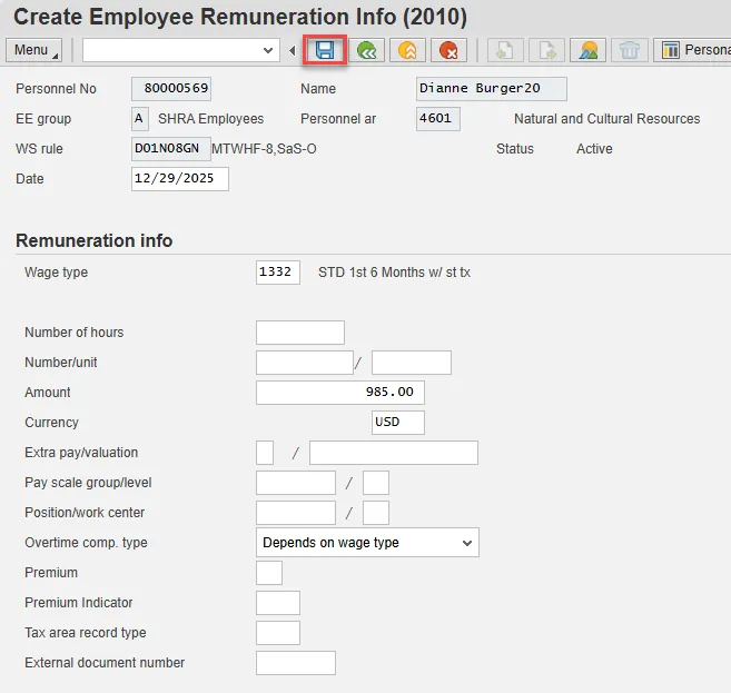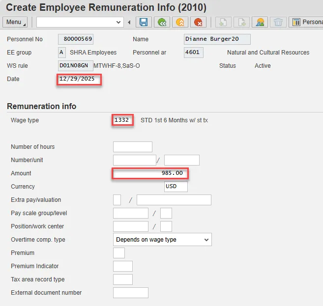Note: Click Edit >> Maintain text to add a comment stating how much the employee is to be paid.