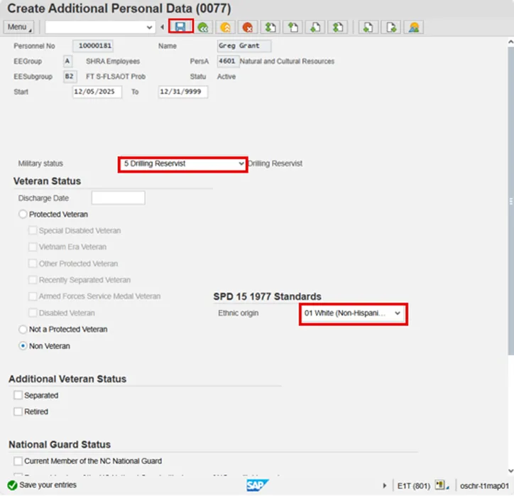 Step 44. On Create Additional Personal Data (0077), update Military status and Ethnic origin fields.