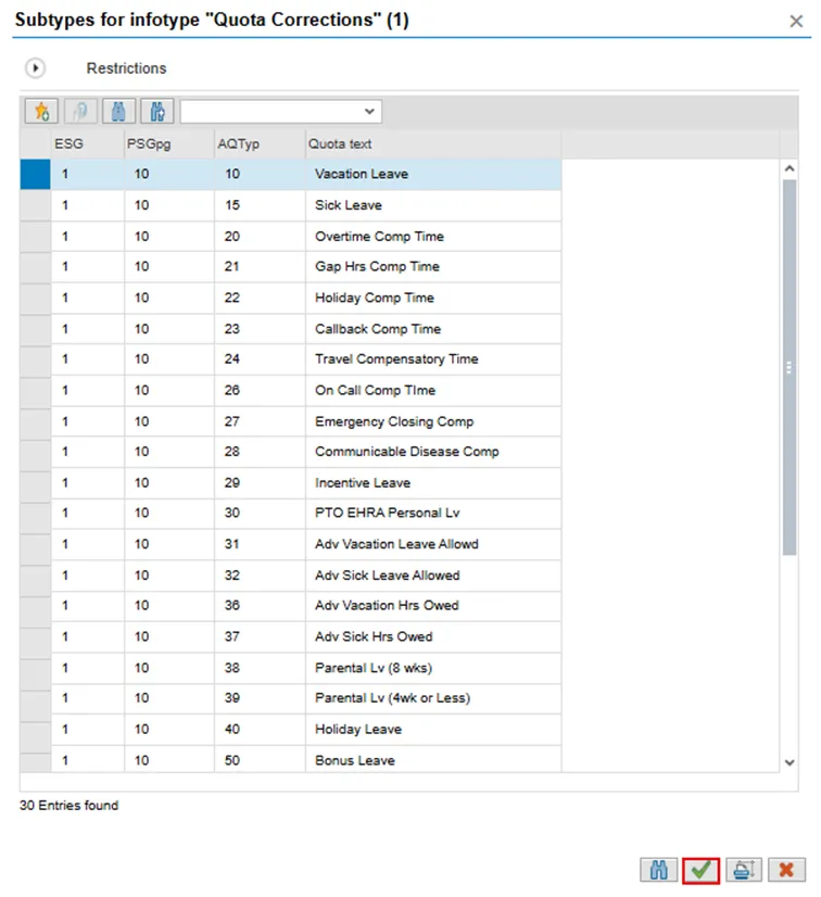 Step 45. On the Subtypes for infotype “Quota Corrections” (1) pop-up, click the Leave type needed. (Military Training, Travel Comp., etc) Select the green check to close the pop-up.