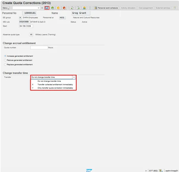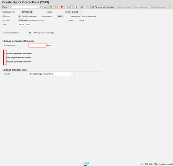 Step 46. On Create Quota Corrections (2013), enter the hours needed within the “Quota Number” field. Select the action to increase, reduce, or replace generated entitlement.