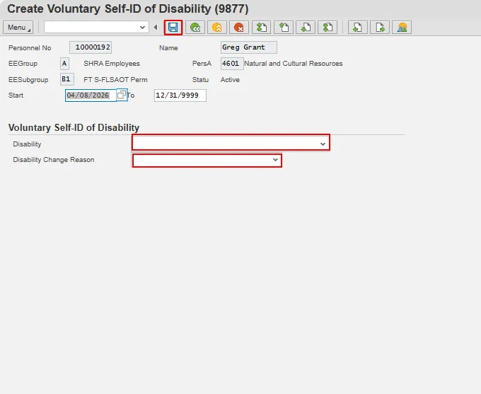 Step 48. On Create Voluntary Self-ID of Disability (9877), make a selection from the “Disability” drop-down menu. Select “Hiring Action” within the “Disability Change Reason” drop-down menu. Enter and Save.