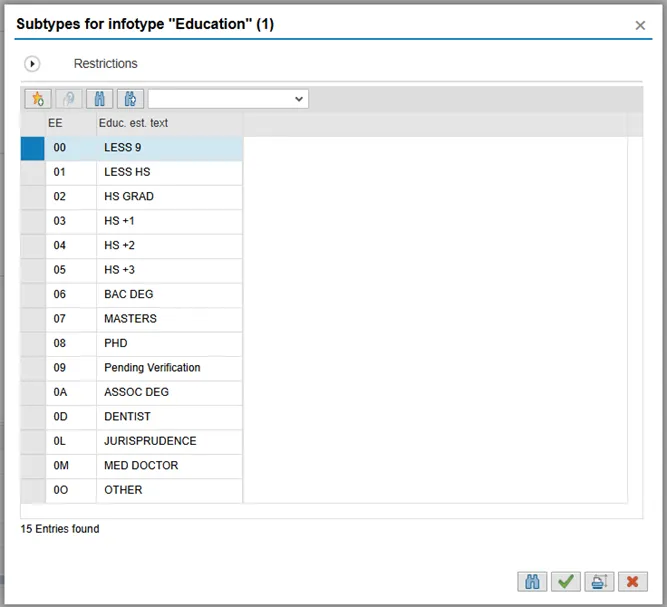 Step 49. On the Subtypes for infotype “Education” (1) pop-up, double-click the level of education to document for the new hire.
