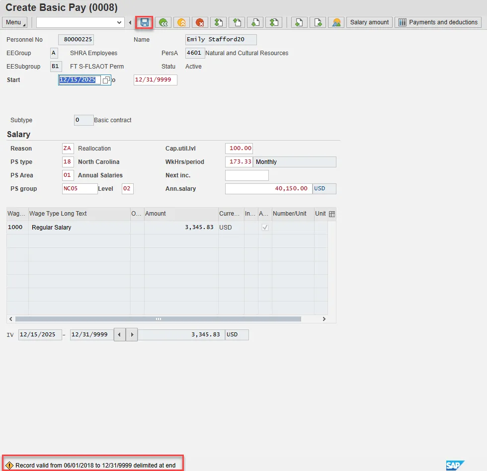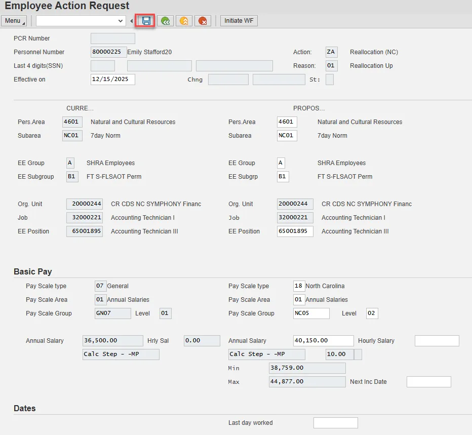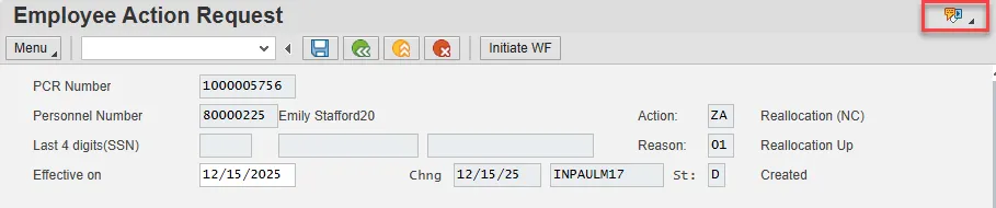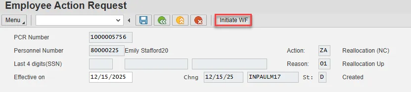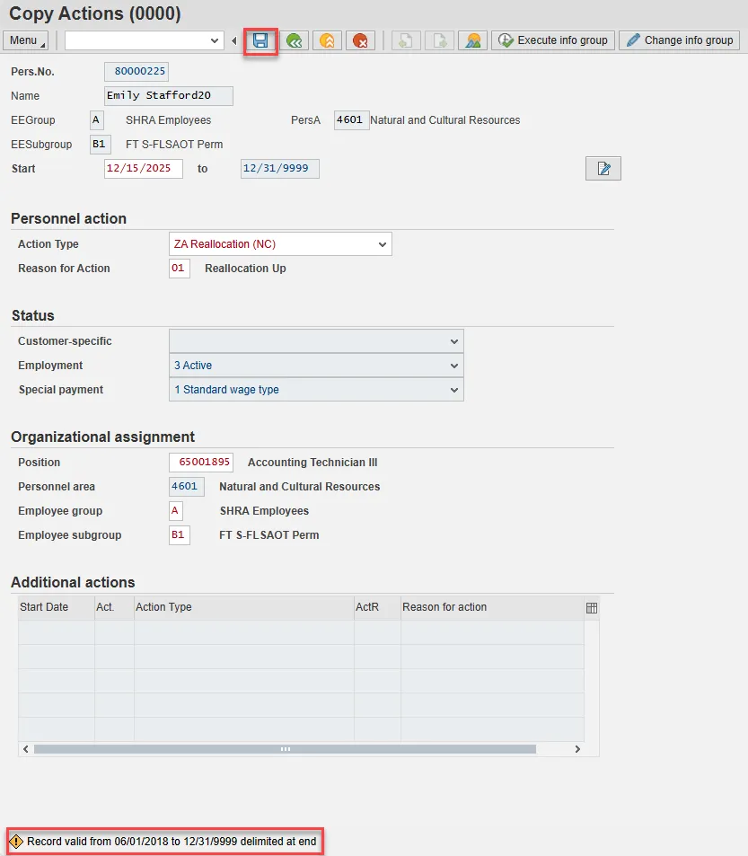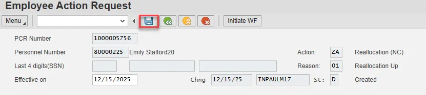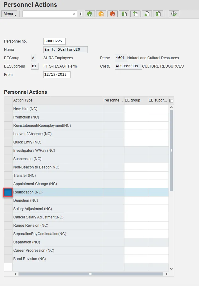 Note: If you do not have the information at the time of the Reallocation action, this can be updated via PA30 later. Enter and Save.