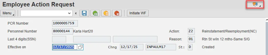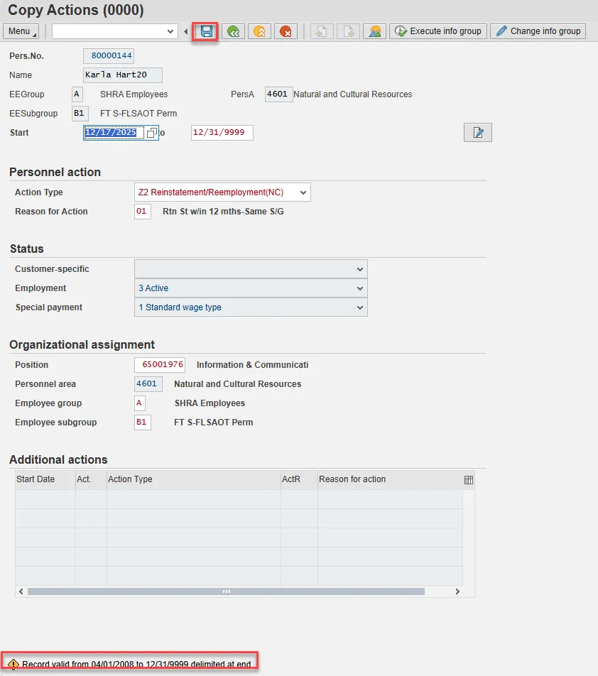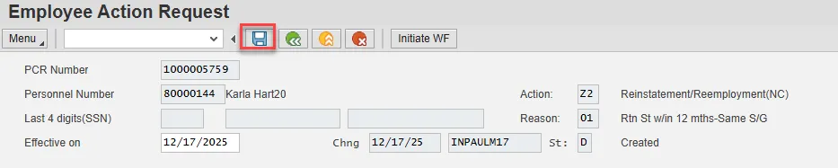 The Reinstatement/Reemployment Action is complete, but we recommend reviewing via PA20 all infotypes that have been processed.