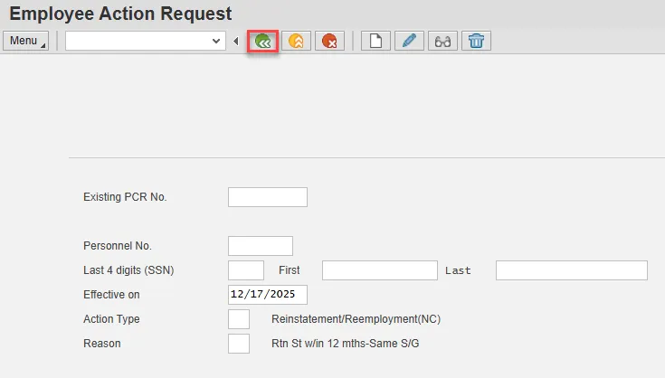 Step 2. On the Employee Action Request screen, complete the Personnel No. field and select Enter on the keyboard.