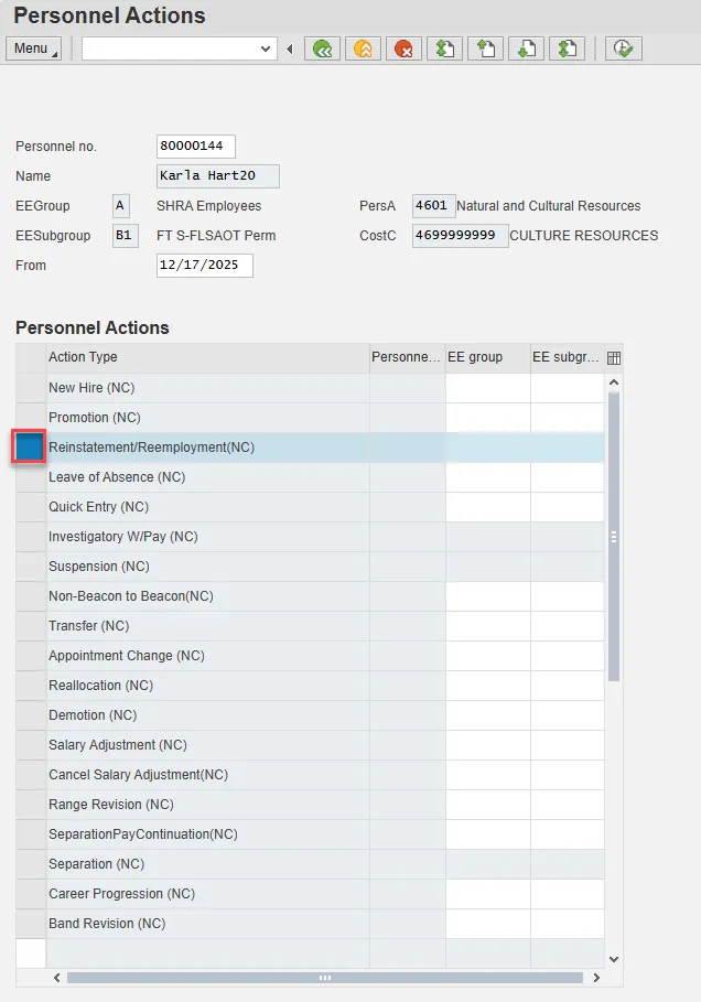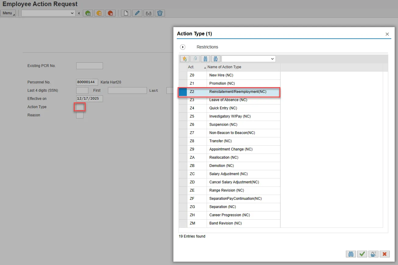 Step 4. Select the Action Type field and access the matchcode. Double click Z2 Reinstatement/Reemployment (NC) from the list.