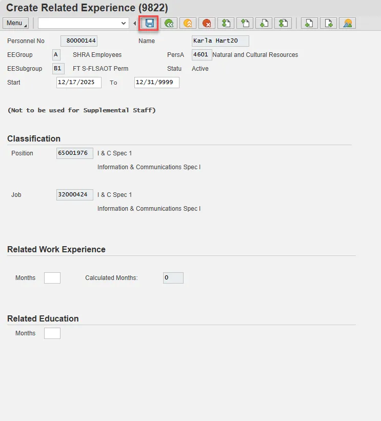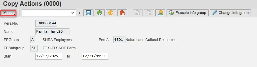 If you receive a Display Messages pop-up, choose the green check and then choose Enter and/or Save to progress to the next infotype.