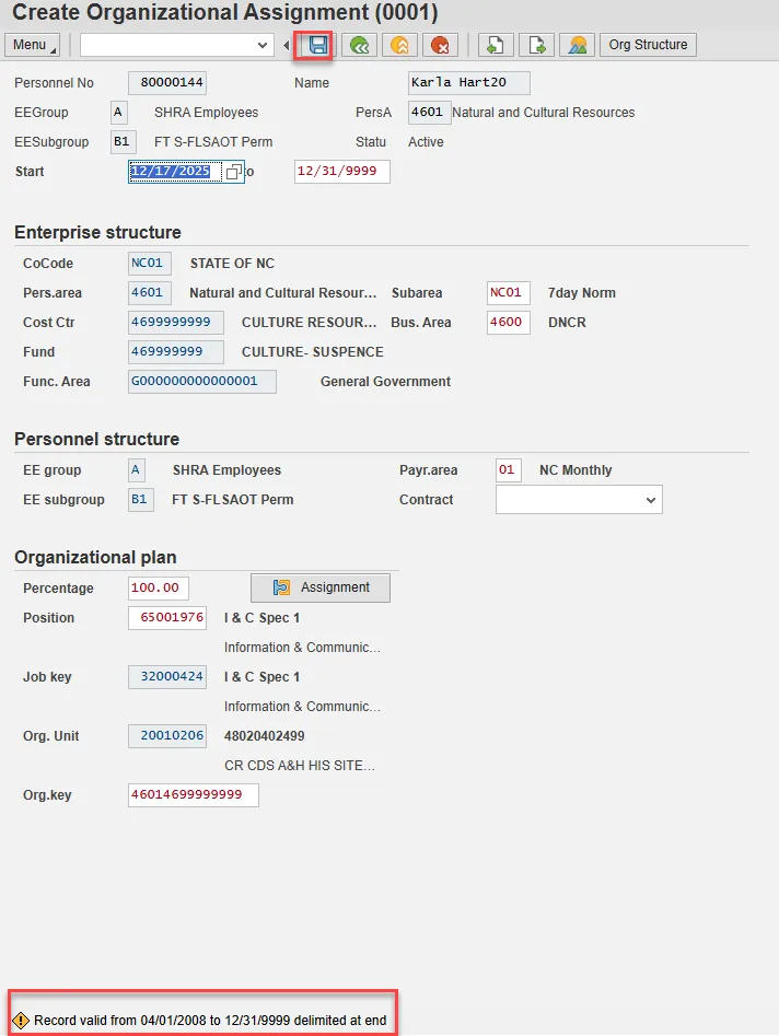 Step 14. Create Organizational Assignment (0001) will populate. There are no changes needed to this infotype. Select Enter on the keyboard.