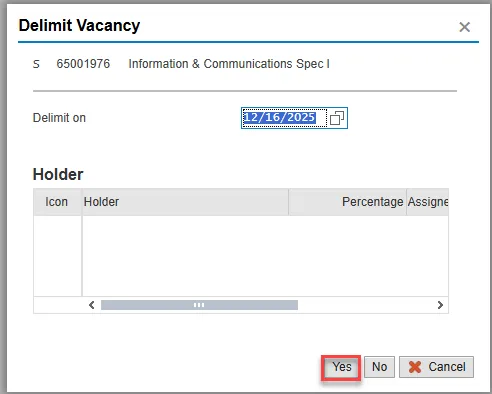 Step 16. On the Delimit Vacancy pop-up, select Yes in the bottom right.