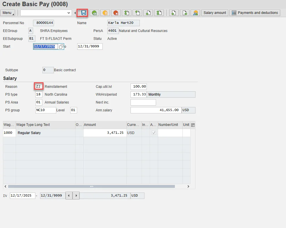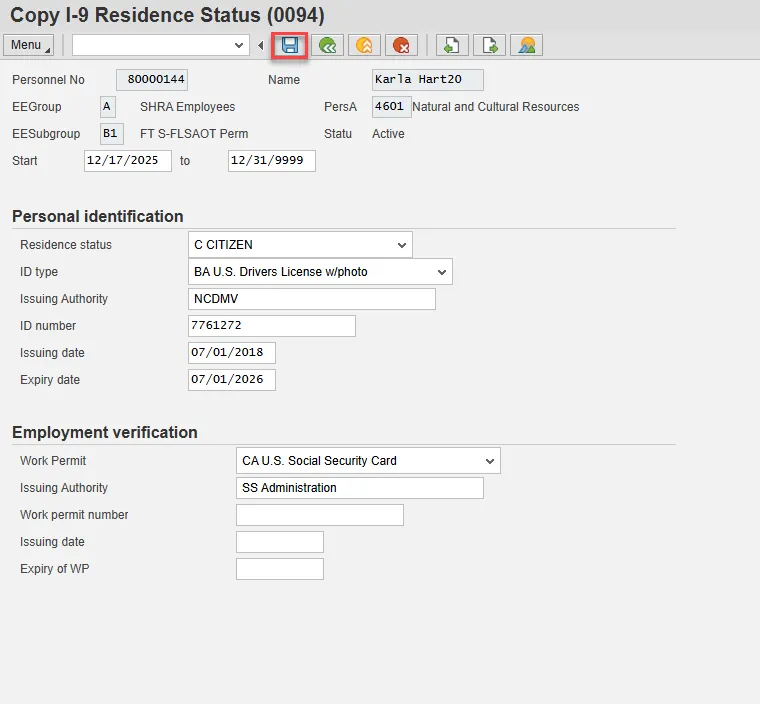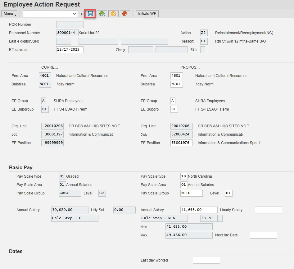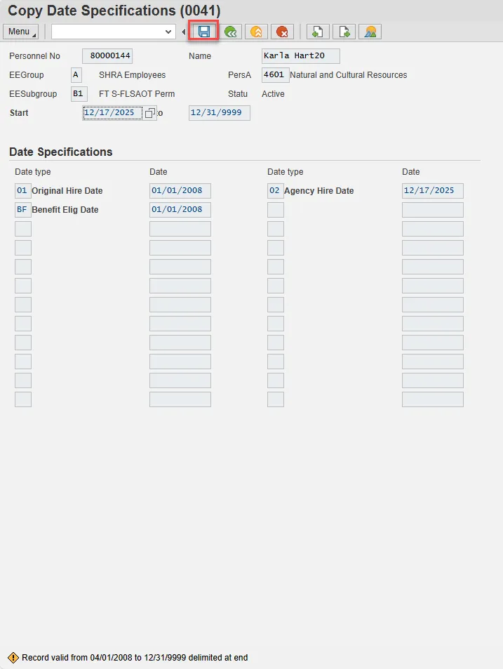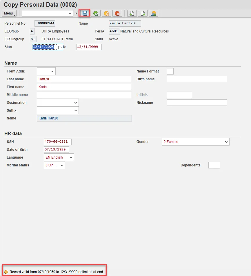 Step 17. Check the HR data section of Copy Personal Data (0002) for accuracy. Select Enter and Save.