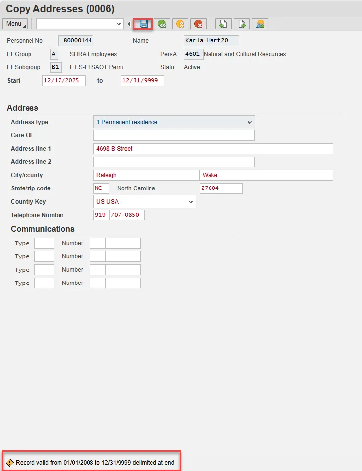 Step 18. On Create Addresses (0006), update the Permanent residence information including the Telephone Number field. Select Enter and Save.