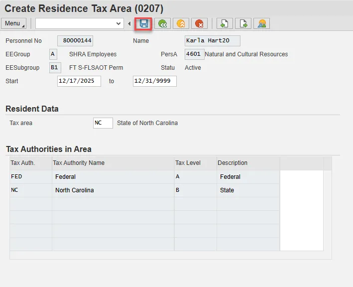 Step 19. On Create Residence Tax Area (0207), verify the default information is correct. Enter and Save.