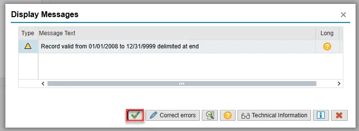 Step 20. If you receive a Display Messages pop-up, choose the green check and then choose Enter and/or Save to progress to the next infotype.
