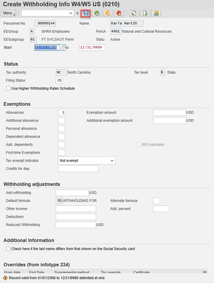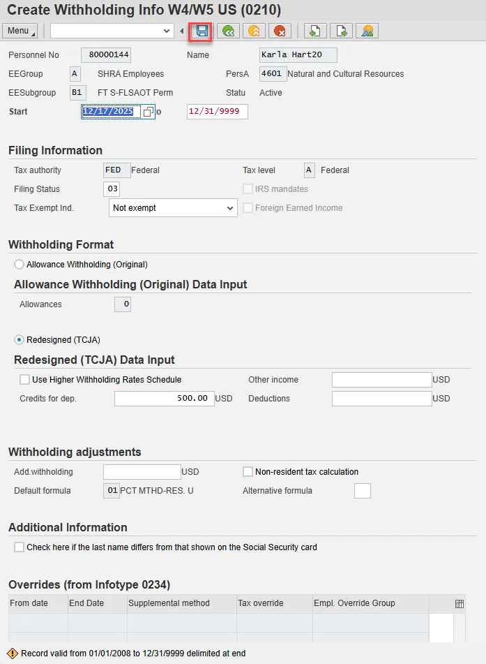 Step 24. On the next Create Withholding Info W4/W5 US (0210) screen, it is best practice is to enter any data as appropriate from the withholding form, review all data, and click Enter to allow the system to validate the data.