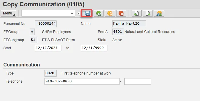 Step 29. On the Create Communication (0105) screen, update the Telephone field. This the employee’s first telephone number at work.