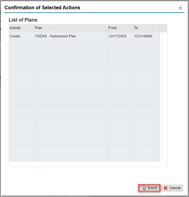 Step 35. On the Confirmation of Selected Actions pop-up, choose Enroll in the bottom right.