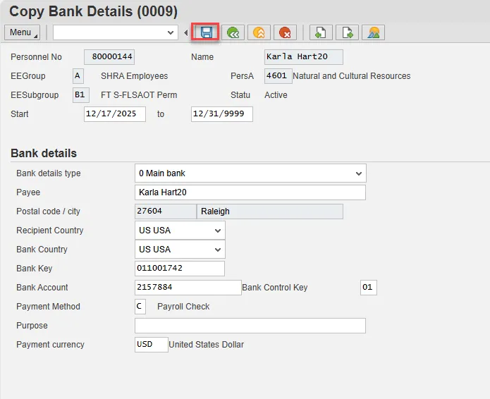 Note: The Bank Control Key and choice of Direct Deposit or Check is MANDATORY, and payroll will not process for this individual without these fields completed. If you don’t have the bank details, please SAVE with ‘C’ and the employee can enter direct deposit via ESS or HR when the information is received. Employees must use direct deposit unless an exception is granted by the State Controller.