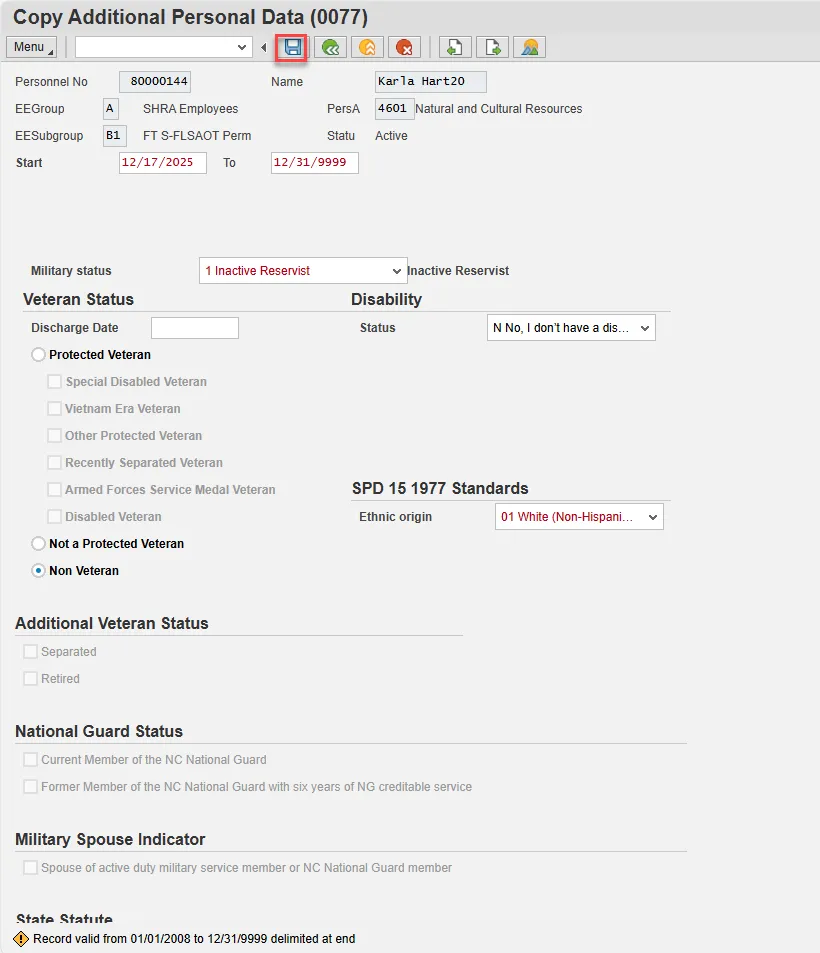 Step 40. On Copy Additional Personal Data (0077), update Military status, Disability status, and Ethnic origin fields.