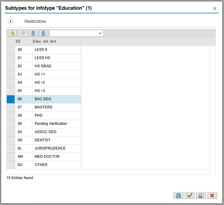 Step 41. On the Subtypes for infotype “Education” (1) pop-up, double-click the level of education to document.