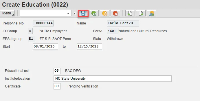 - It is imperative to Save each infotype, even if you are not entering any new data. The system may pre-populate some infotypes based on previous choices. Other infotypes will display dynamically based on which infotypes have been saved. If you click “Next” through an infotype, the record is not saved, and background processing may not work correctly.