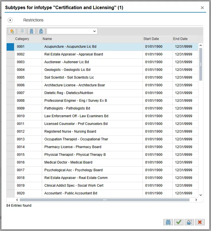 Step 44. On the Certification and Licensing pop-up, double-click the certificate or license held by the new hire. This infotype is used when the position requires a specific certificate or license. If this is not needed, simply use the X in the upper right to close the pop-up. If it is needed, once you double-click the certificate/license, it will take you to a screen to enter information.