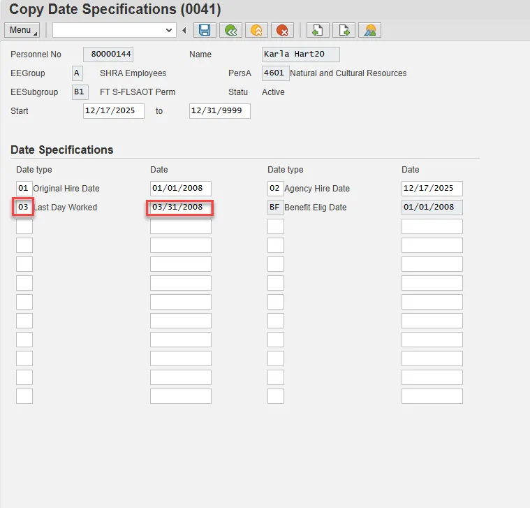 Step 45. On Copy Date Specifications (0041), delete the date type 03 Last Day Worked and the associated date.