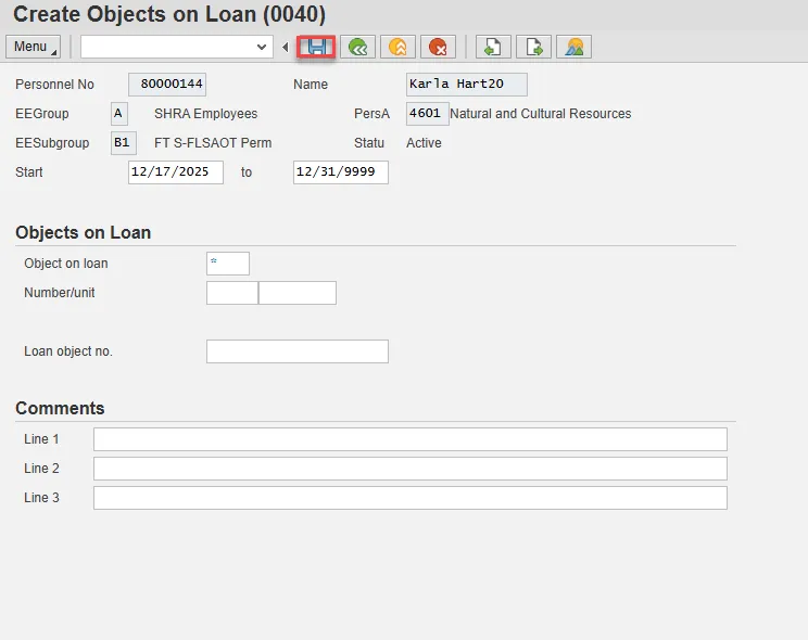 Note: If the employee receives more than one item on loan, process a PA30 transaction in order to add the additional items to infotype 0040.