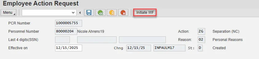Select the Initiate Workflow button to send the Reinstatement Action through the approval process. No changes can be made after the PCR has been submitted for approval, unless the PCR is rejected at any stage and sent back to you (the initiator/requestor).