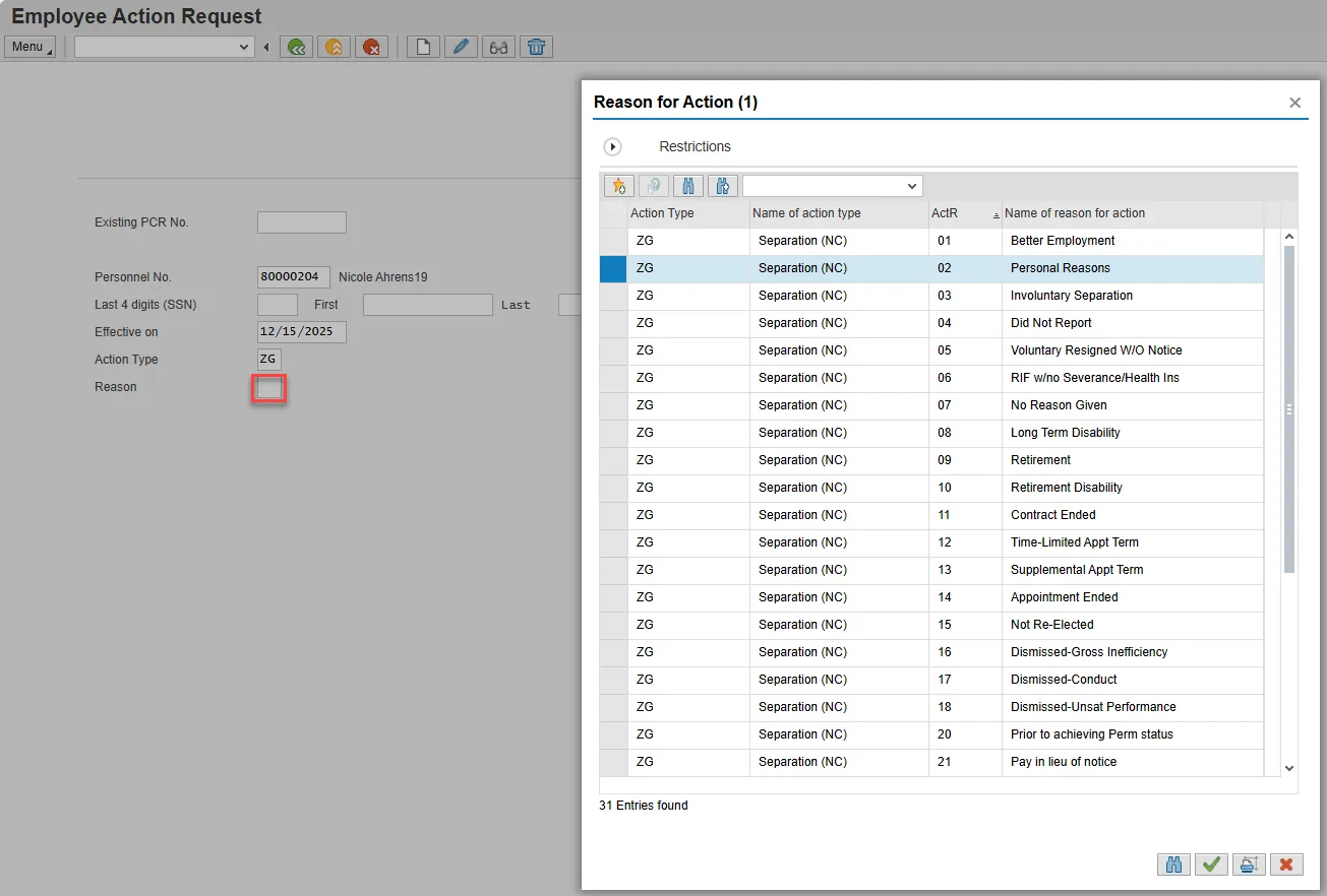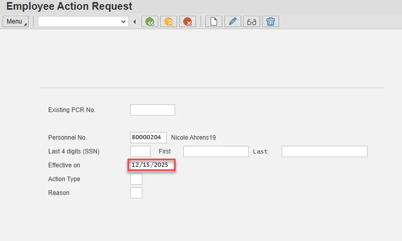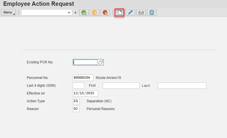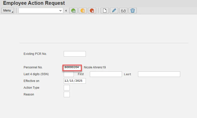 Step 2. On the Employee Action Request screen, complete the Personnel No. field and select Enter on the keyboard.