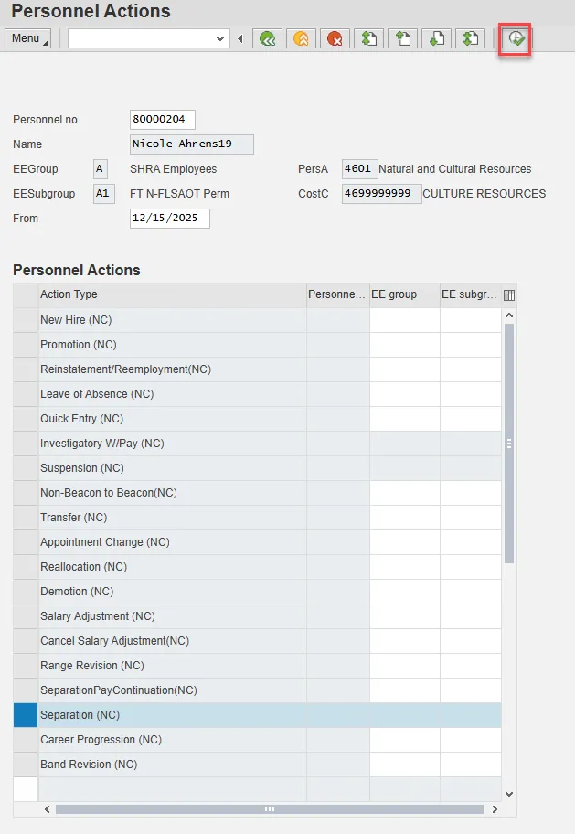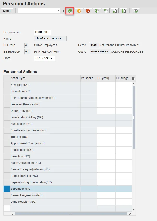 Step 23. Back at the Personnel Actions screen, select the Green Arrow Back button.