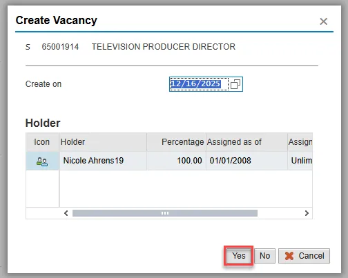 Step 13. Choose Yes on the Create Vacancy pop-up.
